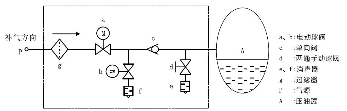 自動(dòng)補(bǔ)氣:當(dāng)自動(dòng)補(bǔ)氣條件滿足時(shí),關(guān)閉電動(dòng)球閥b,打開(kāi)電動(dòng)球閥a,補(bǔ)氣過(guò)程:高壓氣氣源P→過(guò)濾器g→單向閥c→壓油灌A補(bǔ)氣。